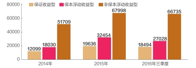 截至2016年三季度,各银行业金融机构共发行保证收益型产品18494款,占比16.5%,平均收益率3.99%;保本浮动收益型产品27028款,占比24.1%,平均收益率3.78%;非保本浮动收益型66735款,占比59.4%,平均收益率4.67%。产品数量和平均收益率较2015年均出现下降。