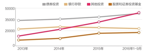截至2016年三季度,保险资金运用余额128286.19亿元,较年初增长14.75%。保险资金运用呈现三大特点:一是固定收益类资产占比下滑但继续保持主导地位;二是其他类投资增速迅猛;三是权益类资产稳中有升。目前,银行存款规模为22961.36亿元,占比17.90%,下滑3.88个百分点;国债、金融债和企业债等各类债券余额为43434.98亿元,占比33.86%,下滑约0.5个百分点。从其他类别来看,投资余额43608.03亿元,占比33.99%,同比增长36.15%。而投资股票和基金的余额为18281.82亿元,占比14.25%,较去年增长7.74%。