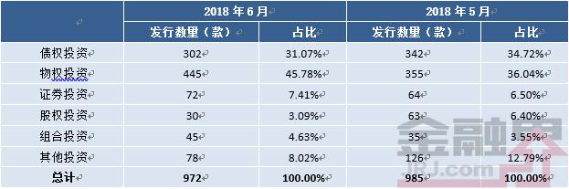 从资金运用方式看(图表8),债权投资类产303款,环比增加15款,占比回落1.62个百分点;物权投资类产品413款,环比增加106款,占比上升7.32个百分点;证券投资类产品73款,环比上升3款,占比回落0.46个百分点;股权投资类产品26款,环比减少38款,占比回落4.52个百分点;组合运用类产品42款,环比增加10款,占比上升0.66个百分点;其他类产品138款,环比增加1款,占比回落1.39个百分点。
