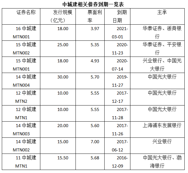 截至11月28日,中城建在银行间市场尚有规模161.5亿元的债券余额本金尚未完成兑付,其中规模达60.5亿元的4笔债券即将于一年内到期。