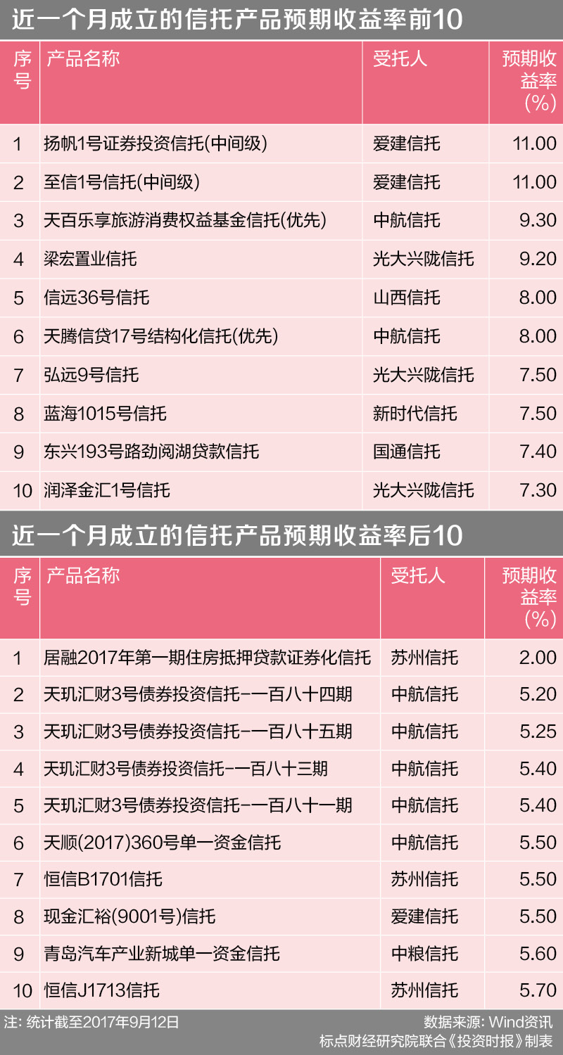 排名倒数的包括苏州信托的居融2017年第一期住房抵押贷款证券化信托,预期收益率2%最低,另外中航信托天玑汇财3号债券投资信托也排名靠后。