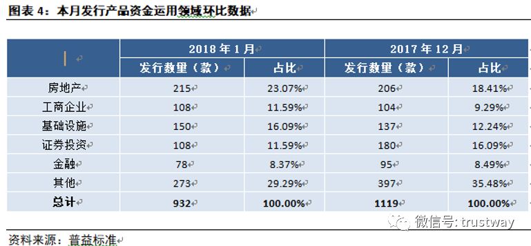 具体而言,1月份,投资于房地产领域的产品215款,环比增加9款,占比上升4.66个百分点;投资于工商企业领域的产品108款,环比增加4款,占比上升2.30个百分点;投资于基础设施领域的产品150款,环比增加13款,占比上升3.85个百分点;投资于证券投资领域的产品108款,环比减少72款,占比回落4.50个百分点;投资于金融领域的产品78款,环比减少17款,占比回落0.12个百分点;投资于其他领域的产品273款,环比减少124款,占比回落6.19个百分点。