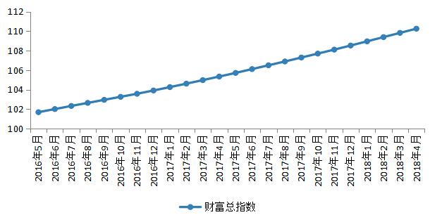 长三角地区银行理财财富稳定累积。由于银行理财通常以预期收益的形式发行,因此收益与时间呈现正相关关系。由图可见,长三角地区银行理财市场财富指数随时间推移持续上行,仅有单月增幅差异的变化。2018年4月,长三角地区财富指数涨幅与上月持平,环比上涨0.43点至110.25点,理财财富稳定累积。