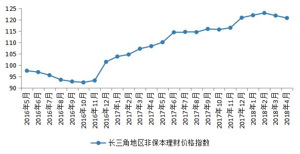 长三角地区非保本开放式理财价格指数下跌态势延续。本月,长三角地区非保本开放式理财价格指数继续稳定下降。尽管受到中美贸易战等外部冲击和国内资管新规落地的内部压力,市场流动性受到一定影响,但在“防风险,守底线”的政策基调下,央行灵活运用多种货币政策工具缓释流动性紧张,维持了市场的基本稳定,促使市场资金面未出现过紧的局面,反而相对宽松。长三角地区受此影响表现较为明显,该地区非保本理财价格指数已出现连续两个月的下降。