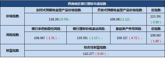 西南地区银行理财风险指数是由目标银行承担的隐形风险、产品的价格波动风险以及投资于基础资产传递的风险三类风险加权所得,主要反映了银行理财市场的整体风险状况。该指数越大说明对应市场的风险也越高,反之则风险越低。
