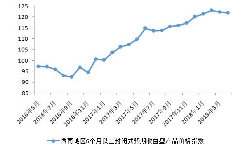 长期理财产品价格指数继续下降。从西南地区价格指数走势来看,2018年4月西南地区6个月以上封闭式预期收益型产品价格指数继续呈现下滑走势,环比下滑0.53点至121.93点,降幅为0.43%。从4月的变化趋势来看,随着央行平抑了4月中期的流动性扰动因素,长期限封闭式预期收益型产品收益没有继续上涨的动力,继续延续3月的下滑趋势平稳下行。受资管新规要求影响,未来银行理财产品的流动性表现将逐步走向两个极端,也即是采用市值法估值的高流动性产品以及采用成本法估值非标等资产的封闭式长期限产品。从收益表现上来看,未来长期限封闭式产品将具有中等收益、低流动性、高稳定性的特征。但如何引导客户选择长期限产品,将是银行面临的一大考验。