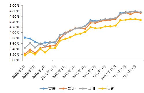 在各省理财收益对比中,4月西南地区各省银行理财收益均呈现小幅回落变化。其中四川省理财产品收益下滑3BP至4.75%,但仍然位居西南地区首位;重庆地区理财收益紧随其后,仅落后四川省1BP;贵州省理财产品收益在3月大幅上涨后,于4月迎来了回调,环比下滑4BP至4.72%;云南省理财产品收益仍然处于较低水平,当月理财收益仅为4.46%,远低于川渝黔三省市。资管新规落地后,各家银行理财产品研发的重心将转向净值型产品,但在转型初期,预期收益型产品仍将是理财市场的主力,各地区理财产品收益差异将不会出现明显变动。