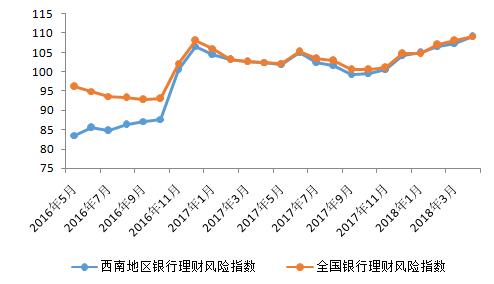 受政策环境影响,理财风险小幅上行。2018年4月,西南地区银行理财风险指数较3月继续上涨,环比上涨1.8点至109.06点。从近期风险指数走势来看,西南地区风险持续走高,但同时全国银行理财风险指数也持续上涨,整体保持了相对一致的步伐,说明西南地区受地区特质风险影响较小,整体风险可控。随着资管新规正式版本的出台,相关业务的细则措施也将陆续发布,传统银行业务面临较大的转型压力。但监管层面防范系统性风险的工作基调未改变,预计在银行转型期间,各类风险将得到抑制。