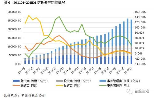 事务管理类信托规模为15.14万亿元,环比减少5044亿元,同比增速则由2017年4季度的55.43%下降到31.89%,尽管占比仍接近60%,但较2017年4季度回落0.5个百分点,扭转自2014年以来占比不断上升的局面。