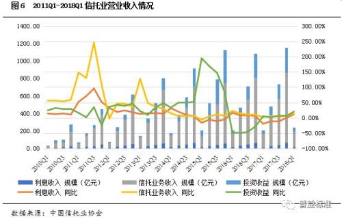 从营业收入来看,截止到2018年1季度,信托业实现营业收入总额243.36亿元,同比增长12.25%,增速达到2016Q1以来各季度中最高值;实现利润总额167.67亿元,同比增长7.92%,增速在2016Q1以来较高。