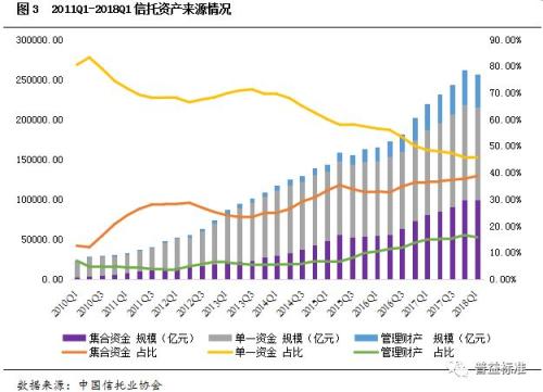 2018年1季度末,单一资金信托规模合计11.66万亿元,占比45.54%,规模增速从2017Q2的51.25%连续下降到2018Q1的23.40%;集合资金信托规模为9.92万亿元,占比为38.73%,同比增速从2017Q1的13.56%下降到9.53%,变化幅度相对稳定;管理财产类信托规模4.03万亿元,占比为15.73%,同比增速从2017Q1的89.56%下降到22.89%,同样增速回落巨大。