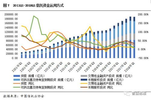 从信托资金的运用看,贷款、交易性金融资产投资、可供出售及持有至到期投资以及长期股权投资是目前信托资金4种最主要的运用方式,合计占2018Q1信托资金比重达87.71%。