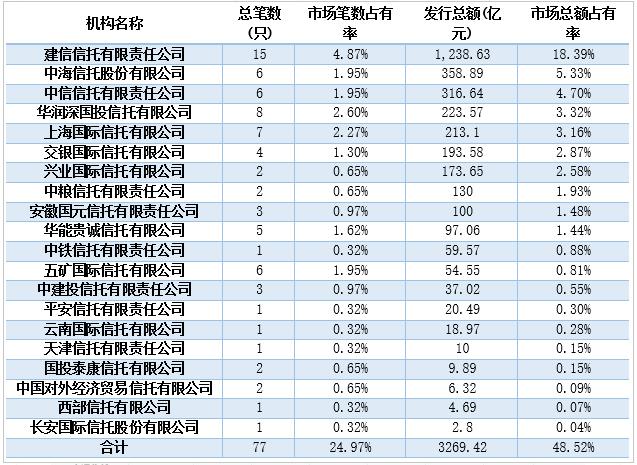 在2018年上半年,一共有20家信托公司在全国银行间市场发行了77只证券化产品,合计发行规模3269.42亿元,市场总额占有率达到48.52%,已逼近整个ABS市场的半壁江山。其中,建信信托以15单,累计发行总额1,238.63亿元的总成绩在这一阶段卫冕首位。