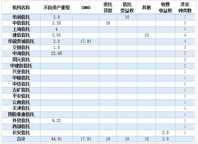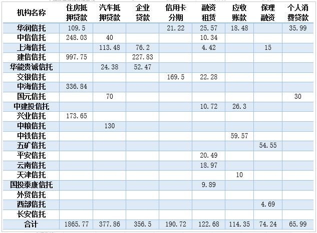 就信托公司利用基础资产的多样性而言,华润信托涉及的种类最多,包括住房抵押贷款、信用卡分期、融资租赁、应收账款、个人消费贷款、不良资产重组、信托受益权七大类。