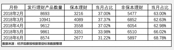 尤其在资管新规落地后,保本理财的产品发行数量在当月占比有明显的下降,非保本理财产品发行数量同比上升。