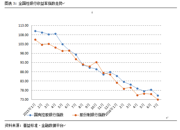 在2016年2季度中,股份制银行收益率指数整体呈现了微幅向上的趋势。股份制银行收益率指数在2季度的上升与3月末和4月初的大幅下跌有一定的关系,同时也与年中时点有一定的关系。进入7月后,股份制银行指数则出现了明显的下滑表现,跌破4月最低点至73.12。国有银行在7月前收益率指数呈现了下滑幅度逐步收窄的趋势,且在6月其指数表现出明显的向上趋势。在7月中,国有银行收益率指数在年中节点过后也出现了极为明显的下跌表现,下滑幅度达3.97%。