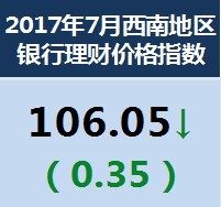 西南地区银行理财价格指数小幅下滑。7月,西南地区银行理财市场价格指数相比上月环比下滑0.35点至106.05点,结束了该地区价格指数长达8个月的持续上扬。2017年上半年,西南地区银行理财价格指数的持续上扬主要受资金面趋紧、监管调整、银行负债结构调整等多方面因素影响。在资金面相对宽松,且监管调整逐步从驻场期过渡到相对平稳的整改期后,银行理财价格指数的向上动力略显不足,在加上6月冲高后的时点性反弹,7月价格指数的下滑属正常表现。
