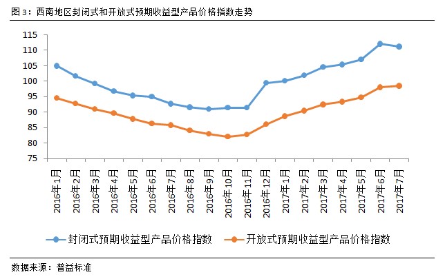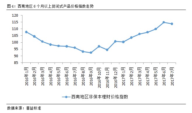 6个月以上封闭式预期收益型指数明显下滑。从西南地区价格指数走势来看,截至2017年7月,西南地区6个月以上封闭式预期收益型产品价格指数在连续6个月的上行之后迎来了小幅下滑。从7月的具体数值来看,西南地区6个月以上封闭式预期收益型产品价格指数环比下滑1.11点至113.66点,下滑幅度为0.97%,凸显出长期限产品也会在一定程度上受到的时点因素及资金面因素影响。从近期监管的态度来看,过高的理财产品收益加大了银行的负担,部分银行理财产品出现产品端与资产端收益倒挂的情况,因此随着监管的关注以及年中时点的过去,理财产品价格指数将在难出现持续上行表现。