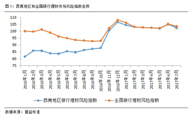 2017年7月,随着年中考核结束,西南地区理财产品价格指数及风险指数均有不同程度回落,未来走势将更趋于平缓。