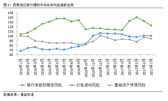 7月,西南地区由银行承担的隐性风险指数环比下滑0.63点至100.44点;价格波动风险环比下滑9.81点至122.78点;基础资产传导的风险指数环比下滑3.05点至94.56点。2017年西南地区银行贯彻审慎经营的思路,整体发展更为稳健,促使银行承担的隐性风险维持在低位,随着金融监管的持续升级,预计该风险将长期维持低位振荡的表现。自6月资金面紧张局面有所缓和后,银行理财资金成本有所回落,理财产品定价空间相对更大,产品端与资产端收益倒挂的压力降低,价格波动风险也随之回落。对于基础资产传导风险而言,在债市经历了三个季度调整逐步企稳后,基础资产传导风险也随之下滑。随着银行在合规经营和业务转型上的不断推进,西南地区银行理财风险指数或将持续降低,促使该地区理财业务稳步发展。