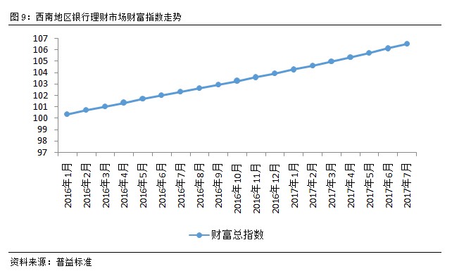 从财富指数来看,西南地区银行理财市场财富指数持续上行,7月相比上月环比上涨0.39点至106.51点,表明银行理财产品具有稳定的保值增值功能。