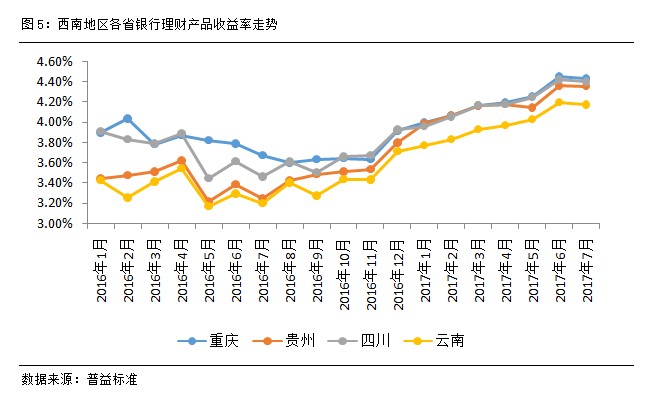 从各省理财收益对比来看,7月西南地区各省收益均呈现不同程度的下滑。四川和重庆地区银行理财产品收益分别下滑至4.40%和4.43%,但仍然较其它省份有明显的优势。云南和贵州地区银行理财收益则相对较低,分别为4.17%和4.35%。在区域平均收益整体下滑的同时,云南的地区理财收益相对偏低,且在本月收益下滑幅度更为明显,凸显了该地区整体竞争不甚激烈,市场资金需求相对偏弱。