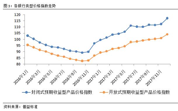 两类指数均大幅上涨,封闭式涨幅仍然大于开放式。12月,全国范围内封闭式和开放式预期收益型产品价格指数均呈现上行走势。其中,封闭式产品价格指数环比上涨4.67点至117.04点;开放式产品价格指数环比上涨3.05点至104.01点。纵观2017年全年唯一与12月涨幅相当的是2017年的6月,凸显了半年末及年末时点对于银行理财的冲击仍然远大于季度时点。但相比而言,年末各类银行理财价格指数的涨幅仍然大于年中,凸显年末的资金需求仍然是全年最高,同时也是购买理财产品的最黄金时点。