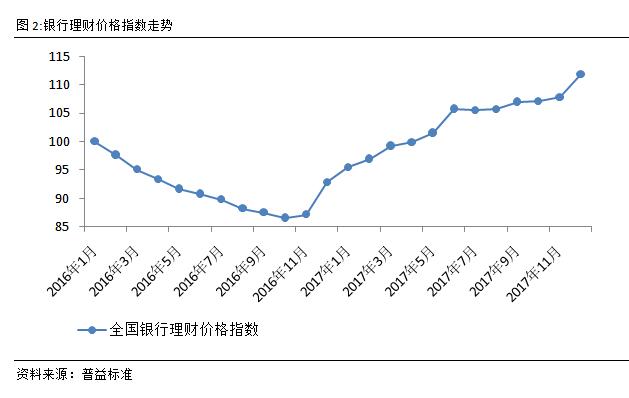 银行理财价格指数大涨,整体收益凸显竞争力。12月银行理财价格指数大幅上涨,环比上涨4.03点至111.83点。从走势变化来看,2017年下半年在央行流动性调控的影响下,市场流动性趋于平稳,但12月年末效应对于银行的影响仍然超过预期,即使在央行对于市场流动性已做出“水平较高”的判定后,银行的资金需求程度仍然处于高位,促使理财整体收益持续上涨。当然,受短期因素影响的上涨表现必然会有所反弹,预计2018年1月,理财价格指数必然出现一定幅度的回落。