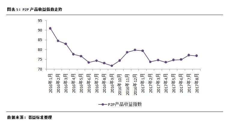 从最新数据显示,相比银行理财规模增速的下滑,信托业的受托资产达23.14万亿,环比增速高达5.33%,喻示着信托行业仍将保证了稳中有升的表现。P2P收益指数在连续两月上涨之后,本月P2P收益指数基本与上月持平,环比下滑0.29点至76.91点,整体收益表现趋于稳定。