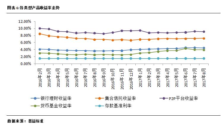 银行理财产品收益在2017年8月有所下滑,但调整幅度不大,预计银行理财产品整体稳健的收益表现仍会延续,短期内银行理财产品较难出现明显下行表现。同时,相对于其它理财产品,银行理财产品的风险维持在较低水平,投资者可以放心买入。货币基金收益率在8月继续下滑,环比下滑8个BP,重回“3%”的范围,随着监管增强对于货币基金投向的监管力度,预计该类产品收益仍有继续下行可能。