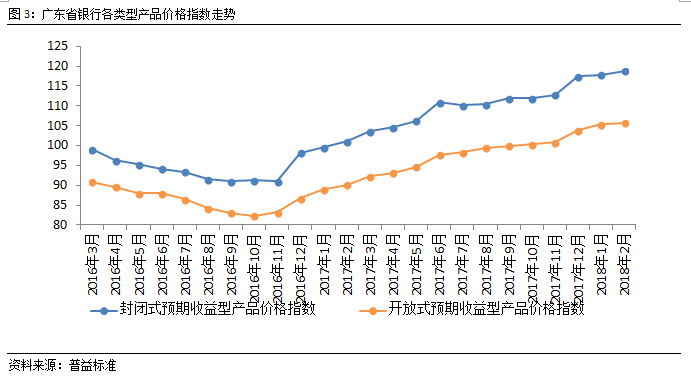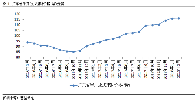 各类产品价格指数继续上涨,开放式预期收益型产品价格指数增速低于封闭式产品。与1月广东省封闭式预期收益型与开放式预期收益型产品价格指数纷纷收窄不同,2月,封闭式预期收益型产品价格指数涨幅扩张,而开放式预期收益型产品价格指数涨幅收窄。开放式预期收益型产品价格指数本月走势平坦,与封闭式预期收益型产品价格指数走势相反。封闭式预期收益型产品价格指数环比上涨0.8%,而开放式预期收益型产品价格指数环比上涨0.3%。在年末考核前后与春节前后,封闭式预期收益型产品的波动较开放式预期收益型产品波动更大,说明封闭式预期收益型产品受时间节点的影响更大。