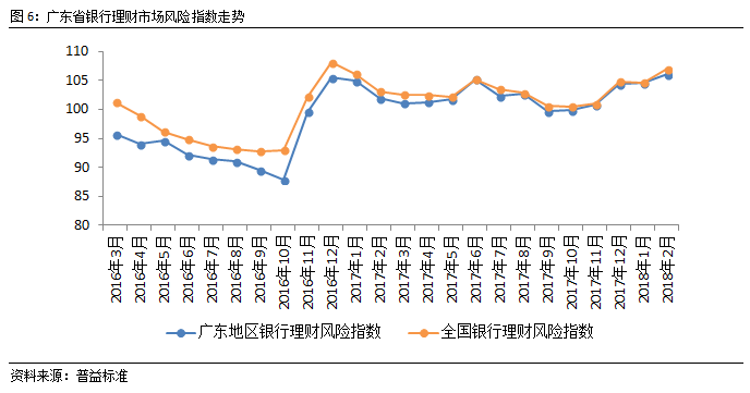 从风险指数来看,2月,广东省理财风险水平有所上升,环比上涨1.63点至106.14点,但是低于全国平均水平。在防风险,去杠杆背景下,银行理财步入转型之路,资管新规即将落地,受监管、资金面影响,理财价格波动风险近一步上升。在经历1月股市暴跌之后,股市趋于稳定,两会临近,市场处于维稳状态,基础资产传导风险近一步下降。