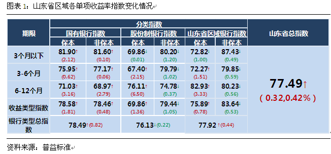 6月,山东地区银行理财指数上涨0.32点至77.17点。其中,国有行指数在经历了较长时间的低迷之后本月全面上涨,6-12个月期限的产品涨幅尤其明显。股份行指数小幅收窄。在中上期限的保本类产品的强势带动下,山东省区域银行理财收益率指数上涨0.44点至77.92点,夺得本月全区域理财指数涨幅之冠。从收益率来看,互联网宝宝类理财产品收益率在先降后涨之后报收2.67%,相较上期小幅下跌;山东省区域理财收益率在经历了本月的强势上涨之后报收4.10%;短期银行理财产品平均收益率亦有小幅回升,最终报收3.84%。