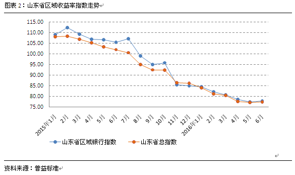 2016年上半年,山东省区域银行指数及山东省总指数均呈现了下滑趋势,但下滑幅度逐步收窄,愈发平缓。6月中,山东省区域银行收益率指数出现了一定幅度的上升,但受到年中效应的影响,因此下半年收益率指数继续出现小幅下滑的情况可能性较大。山东省总指数在2016年中基本维持了与山东省区域银行相仿的下滑趋势,这与山东省区域银行在当地影响力较大,有较大关系,在6月山东省总指数环比上升了0.42%。