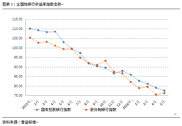 在2016年中,国有控股银行收益率指数保持了平稳下滑的趋势。5月中,国有控股银行收益率指数环比下滑2.55%,较4月下滑幅度有微幅减弱,整体向下表现仍将持续。股份制银行收益率指数在2016年中波动相对较大,4月中股份制银行收益率指数环比有明显下滑,下滑幅度达5.21%,但5月又重新出现了小幅抬升的情况。不过从整体看,2016年股份制银行同样保持波动下滑的态势。整体来看,全国性银行收益率指数下滑幅度维持在2%-3%之间。