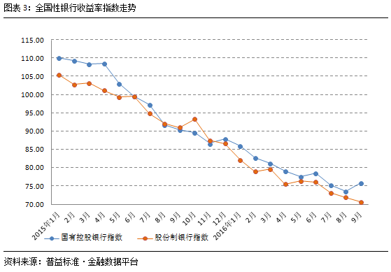 从期限类型来看,在2016年9月,不同期限类型理财产品收益率指数变化表现近似,各期限产品出现了明显的向上趋势,整体来看中短期限产品向上幅度相对更大。从不同发行机构角度来看,9月中,各发行主体指数呈现了明显的向上趋势。国有银行长期限保本与非保本产品收益率指数在上月呈现小幅上升趋势后,本月出现了极为明显的下滑,这可能与9月某股份行长期限产品无法兑付事件有一定的关系。中短期限产品也表现了出了与上月极大的差异,除3个月以下非保本产品外,其它各维度均出现了极大幅度的上升,尤其是3个月以下保本类理财产品,环比上升高达15%。同时,由于中短期限产品发行量较大,整体权重占比更高,因此国有银行保本类总指数上涨幅度明显;9月中,股份制银行收益率指数并没有如同国有银行指数般出现明显上涨,其保本类产品与非保本类产品呈现了相近的下滑幅度,其中仅6-12个月保本类产品有微幅向上;广东省收益率指数在8月下滑幅度出现了增大迹象,但9月中,广东省收益率指数下滑幅度大幅收窄,其中保本类指数出现了明显的上扬,尤其是6-12个月保本类指数,环比上涨幅度达到10.87%。但非保本类理财产品指数仍然表现为下滑趋势,因此整体来看,广东省区域银行指数表现为微幅下跌。