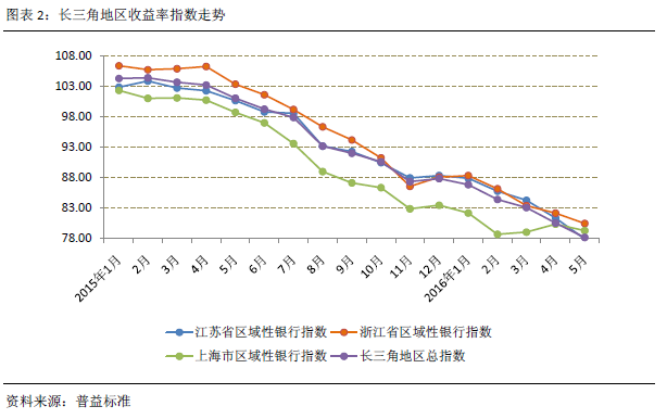 从收益率指数走势图可以看到,本月收益率指数整体下滑幅度有所增大。在2016年3月、4月中,收益率指数下滑表现有明显放缓迹象,5月收益率指数的明显走低与从4月下旬开始的整体收益率走弱表现有相互映射的关系。在5月中,江苏省区域性银行收益率指数下滑幅度相对较大,略大于长三角地区总指数的下滑幅度,而浙江地区下滑幅度仅有微弱增强。上海市区域性银行整体收益率指数在前两月出现极为明显的上扬后,本月指数有较明显的下滑,从2016年整体情况来看,浙江省与江苏省区域性银行整体下滑幅度较大,江苏省区域性银行收益率指数基本保持了3%-4%的下滑幅度,而浙江省区域性银行收益率指数的下滑幅度基本在2%-2.5%之间。而上海市区域性整体指数保持相对平稳的表现。
