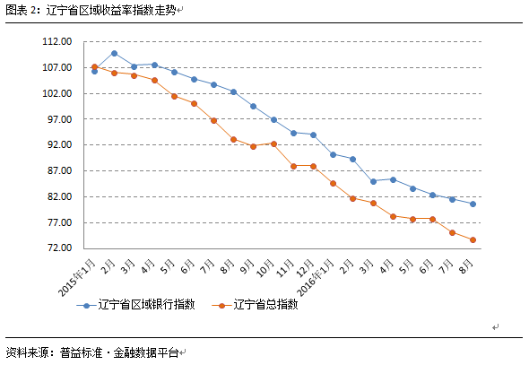 自2016年4月开始,辽宁省区域银行指数呈现下滑幅度持续收窄的趋势,并没有因为6月的年中时点效应而在7月或8月出现明显的下滑表现。相对稳定的收益表现可能极大的增强区域银行相对于全国性银行在辽宁省的竞争力。从近期走势来看,9月辽宁省区域银行指数下滑幅度仍可能继续收窄,但资产荒与监管收严的环境下,指数反转向上的可能性较小。辽宁省总指数的变化则与该省区域银行指数有较大差别,在6月时点过后,指数出现了较大幅度的下滑,虽然在8月总指数有一定幅度的收窄,但整体下滑趋势没有明显改善。从总指数与区域银行指数的变化来看,辽宁省区域银行近期在理财市场表现较为稳定,值得投资者关注。