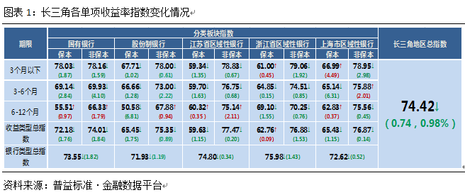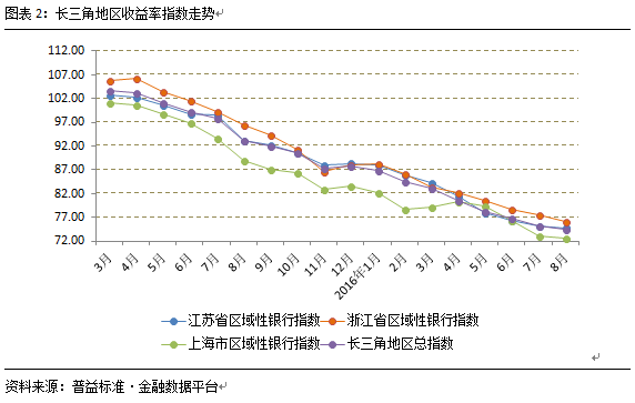 8月,长三角理财产品收益率指数下跌0.74点至74.42点,其中,江苏省区域性银行理财指数仅下跌0.34点至74.80点,下滑幅度有明显放缓;浙江省区域性银行理财指数下跌1.43点至75.98点;上海市区域性银行指数下跌0.52点至72.62点,较上月下滑程度有明显缓和。全国性银行指数跌幅也出现了微幅收窄,股份行指数在继上月的大幅下滑之后,本月下跌1.19点至71.93点。国有行指数下跌3.01点至73.12点。进入8月后相关监管条例接踵而至,对于银行理财业务发展较快的长三角地区区域银行形成了一定的影响。投向及杠杆的限制可能使区域银行在收益率上的领先地位有所动摇。但同样的问题其它区域的区域性银行也会遇到,而长三角地区区域银行在资管领域较强的创新能力,可能使其率先脱颖而出找到新的差异化道路。从绝对收益率来看,互联网理财产品收益率呈现了小幅冲高回落的表现,最终跌破2.5%;江苏省区域性银行理财产品平均收益率为3.90%;浙江省区域性银行理财产品平均收益率也为3.90%,但浙江省银行理财产品平均收益率波动相对较大;上海市银行理财产品平均收益率为3.54%,较7月有明显回升。