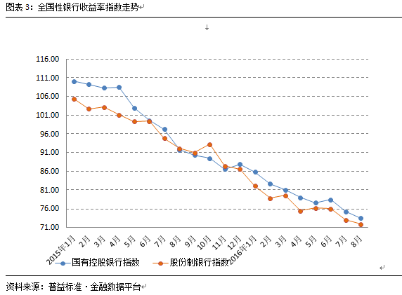 从期限类型来看,在2016年8月,不同期限类型理财产品收益率指数变化有较大差别,其中长期限产品表现出了较为明显的向上趋势,而中短期限产品的下滑幅度也有一定幅度的放缓。从不同发行机构角度来看,8月中,各类发行机构收益率指数均仍然呈现出微幅下滑趋势,下滑幅度较7月有明显的收窄。国有银行长期限保本与非保本产品收益率指数均小幅上升,而中短期限产品收益率指数仍然维持了一定幅度的下滑,其中3-6个月非保本产品收益率指数下滑幅度偏大,环比下滑5.54%。虽然长期限产品指数上涨幅度较为明显,但由于该类产品发行数量较少整体占比极低,因此对国有银行指数影响较小,国有银行指数仍然维持下滑趋势;8月中,股份制银行收益率指数下滑幅度较上月有所收窄,但其保本类产品与非保本类产品仍然呈现较为明显的差异,保本类产品收益率指数持续较明显的下滑表现,而非保本理财产品收益率指数下滑幅度与上月相仿;江苏省区域性银行收益率指数表现与国有银行相仿,长期指数有一定幅度的向上,而中短期指数则有所下滑,但下滑幅度较全国性银行明显偏小,因此江苏省区域银行指数下滑幅度也较国有银行偏小,环比仅下滑0.46%;浙江省收益率指数虽然也呈现了下滑趋势,不过与其它发行主体不同的是,该发行主体的3个月以下期限保本类理财产品收益率指数表现出了微幅的上升趋势,而长期限产品指数则仍然呈现了一定幅度的下滑态势。由于短期保本类产品收益率指数有所上升,带动了浙江保本类产品总指数出现了明显的上涨,但由于非保本指数下滑较为明显,因此总指数也出现了明显的下滑,环比下滑1.84%;上海市区域性银行收益率指数在本月下滑趋势有明显放缓,本月环比仅下滑0.7%。