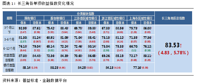 从期限类型来看,在2017年1月,3个月以下期限类型产品收益指数与上月走势相仿,仍然呈现明显上涨的表现,而3-6个月期限与6-12个月期限均有向下表现出现。在当前流动性紧张的局面下,短期产品收益有向上动力。从不同发行机构角度来看,2017年1月份,各发行主体指数变化继续上涨,但上升表现与上月相比有一定变化,其中国有银行类型指数的增长幅度达到1.65%,整体涨幅较小,与上月涨幅相比下滑了10.3%。本月下滑的主要原因为中短期限产品收益指数出现明显收缩,导致整体收益指数有一定的下滑,不过综合近两月的表现来看,国有银行整体涨幅仍然较为可观;1月份,股份制银行收益指数延续前两个月的上涨趋势,其中,短期产品收益指数上涨幅度较上月有明显上升,但长期保本类收益指数却出现了3.02点的下滑表现。本月江苏省区域性银行收益指数在上月小幅上涨的基础上,各类期限收益指数涨幅继续扩大。与2016年最后一月比较,中期产品收益指数涨幅最大,保本类3-6个月产品指数环比上升11.6%。各期限类型上涨明显,促使江苏省环比上涨7.42%,领跑长三角地区。浙江省区域银行总指数也延续了上月较强的上升态势,但短期与长期有一定差异,其中短期及中期收益指数表现出较强涨势,全线飘红,引领整体指数出现大幅上涨,但长期保本收益指数也表现出了明显下滑,环比下降3.16%。上海市区域性银行收益指数表现稳定,中短期限收益指数有微幅上涨,长期收益指数则表现出了下滑趋势,反映出上海市区域银行对于长期市场变化的理解与其它两地区有一定差异。