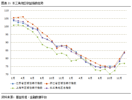 1月,长三角理财产品收益指数大幅上升4.83点至83.53点,其中,江苏省区域性银行理财指数继上月明显上升后在本月继续向上,上涨5.82点至84.25点;浙江省区域性银行理财指数本月也延续上涨趋势,达到84.13点;上海市区域性银行指数向上幅度大幅收窄,上升0.38点至77.16点,其中长期产品出现收益指数下滑表现;国有银行指数也出现了涨幅收窄,或与1月末央行定向释放流动性有一定的关系,仅上升1.39至85.14点;股份行指数延续强势上升的势头,本月环比上升4.66点至80.23点。从整体来看,进入1月后,收益指数仍然大幅上升,主要是由于春节取现、企业缴税、外汇占款流出、缴纳法定存款准备金等多方面因素共同导致。从绝对收益率来看,互联网理财产品收益率呈现上升势头,突破3%关卡,但与银行理财产品差距仍然巨大;江苏省区域性银行理财产品平均收益率达到4.24%,维持在4%以上;浙江省区域性银行理财产品平均收益率为4.29%;而上海市银行理财产品平均收益率为3.77%。