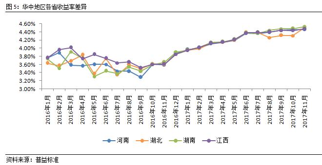 湖北省理财收益涨幅明显,重回地区平均。与上月相比,本月华中各省收益表现较好。其中,除河南省银行理财产品收益与上月持平外,湖北、湖南、江西三省银行理财产品收益较上月均有所上涨。从收益水平来看,华中地区各省银行理财收益水平相差不大,说明各省银行理财市场对资金的需求程度相当。从收益走势来看,河南、湖南、江西三省的银行理财收益表现相对平稳,而湖北省收益前三月的收益水平落后华中地区其他省份较多,本月经过一番明显上涨,收益水平重回地区平均,同时,湖北省理财收益的明显上涨说明该省银行理财市场对资金的需求有明显增加。随着年末时点趋近,各省银行理财市场为抢夺资金,预期理财收益水平将维持上升态势。