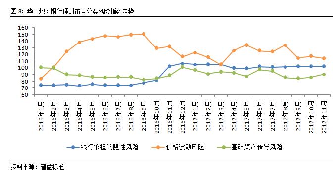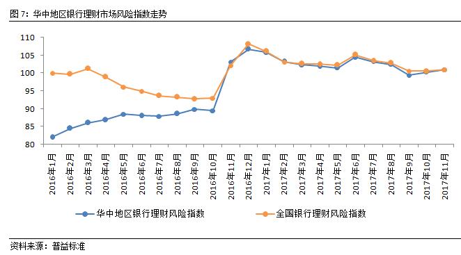 从风险指数来看,11月,华中地区银行理财市场风险指数环比上涨0.74点至100.99点,与全国水平相当。受11月中旬资管新规的影响,基础资产传导风险有所上升,这也是带动华中地区整体风险上行的主要原因。但由于央行有意维护基础货币余额的稳定,本月市场资金面相对平稳,价格波动风险下滑明显。年末市场波动难以避免,但在监管日渐趋严的背景下,预期地区风险不会大幅上扬。