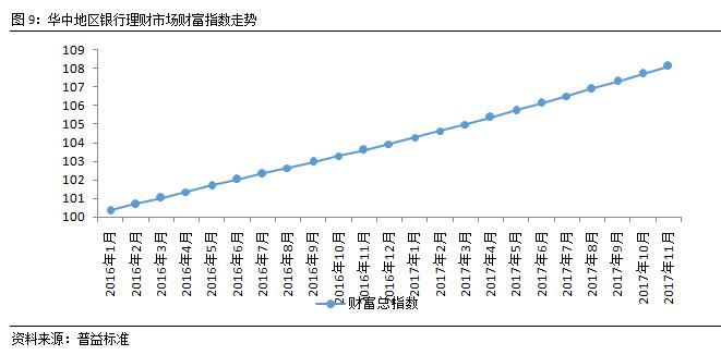 从财富指数来看,本月华中地区财富指数环比上涨0.39点至108.10点,银行理财财富继续稳定累积。