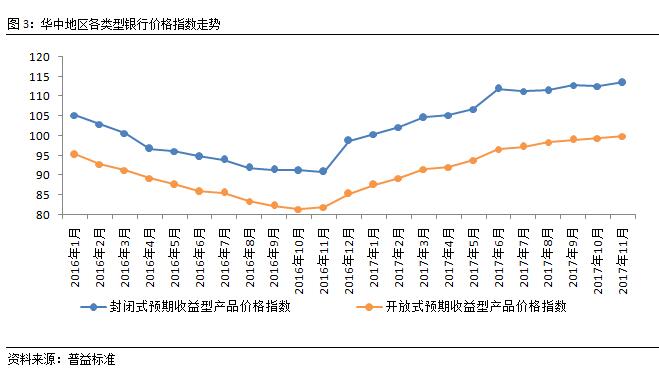 华中地区封闭式与开放式预期收益型产品价格指数双双走高。2017年11月,华中地区银行理财价格指数维持了此前的上行态势,环比上涨0.79点至108.08点。其中,封闭式预期收益型产品价格指数较上月有环比上涨0.98点至113.53点,开放式预期收益型产品价格指数环比上涨0.49点至99.91点。封闭式预期收益型与开放式预期收益型产品价格指数均有所上涨,带动华中地区整体银行理财价格指数上行。