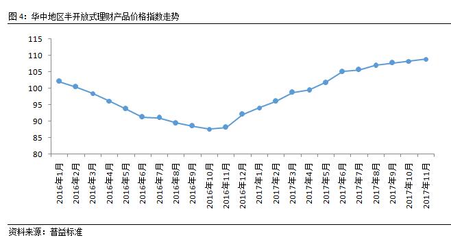 华中地区半开放式理财产品价格指数继续上升。11月,华中地区半开放式理财产品价格指数继续上升,但涨幅未有明显增加。受央行调控影响,11月市场资金面持续平稳,未出现过紧的局面,华中地区半开放式理财产品价格指数因此未出现大幅波动。从价格指数走势来看,该类指数自6月后呈平缓上升态势,表现较为稳定。进入年末时点,市场资金波动难以避免,但在监管趋严、央行有意维护基础货币余额稳定的背景下,预期该类指数在下月也不会出现大幅波动。