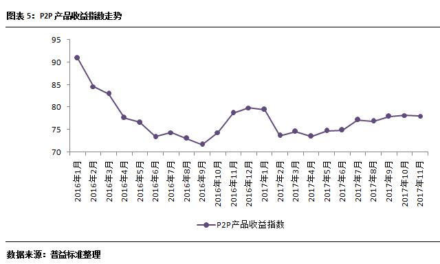 2017年11月,P2P产品收益指数环比下滑0.13点至78.05点。与其它类型金融产品不同的是,“理财新生军”P2P产品的收益指数呈现出了逆势下行变化。P2P产品收益的下滑除了受部分问题平台收益泡沫破裂的影响外,行业逐步成熟也是推动该类产品收益回归正常的重要因素。未来投资者将不仅只关注产品的收益,平台风险、流动性等问题也将成为投资者关注的重点。从今年P2P产品规模的持续上涨来看,投资者对于P2P产品的购买意愿仍然较强,行业发展前景可期。