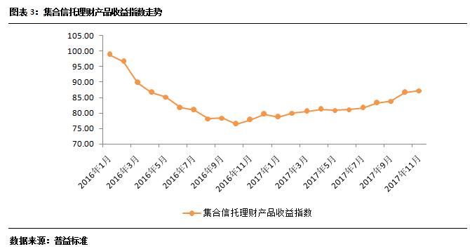 11月,信托产品收益指数继续保持相对稳定的上涨走势,环比上涨0.60点至87.24点。信托理财产品收益的持续上行凸显了企业融资成本的不断增高。另外,从资管新规的内容来看,信托产品净值的生成需符合公允价值原则,高收益预期收益型产品的发展不容乐观,导致未来信托产品将难出现收益大幅上涨的表现,同时新的估值模式不符合大多数高净值客户的需求,信托规模增速也可能因此放缓。