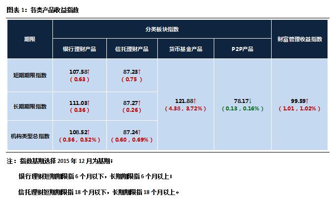 2017年11 月,受年末资金面趋紧的影响,大多数理财产品收益指数均呈现出上涨变化。银行理财产品收益指数在10月微幅回调后,11月表现出了较为明显的上涨态势,环比仅上涨0.56点,至108.52点。具体来看,短期期限指数环比上涨0.63点,至107.58点;而长期期限指数也环比上涨0.36点,至111.03点。相较银行理财产品的平稳表现,货币基金收益指数伴随着资金面的收紧,表现出了较为明显的单月上涨表现,环比上涨4.38点,至121.88点。货币基金收益指数对于资金面变化的敏感反应必将持续至12月,促使货币基金收益指数继续攀升。信托产品收益指数在本月继续维持小幅上行走势,涨幅较10月有明显收敛,符合2017年下半年集合信托理财产品的整体走势,环比上涨0.60点至87.24点。11月出台的《关于规范金融机构资产管理业务的指导意见(征求意见稿)》对于整个资管行业都有较大的冲击,随着监管细则的明确,产品分类的清晰,大资管领域各类金融机构的竞争将更为激烈,不同类型的金融机构也更需要挖掘自身禀赋优势,迎接新的挑战与机遇。与其它类型金融产品不同的是,理财新生军P2P产品在年末收益指数持续回落,环比下滑0.13点至78.17。P2P产品收益的持续下滑除了受部分问题平台收益泡沫破裂的影响外,行业逐步成熟也是推动收益回归正常的重要因素,未来投资者将不仅只关注产品的收益,平台风险、流动性等问题也将成为投资者关注的重点。